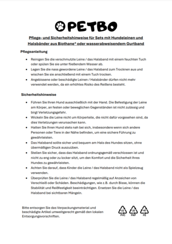 Du kannst für das Leinenmaterial aus einer Auswahl von neun Farben wählen. Zudem bieten wir Dir auf PETBO.de bei allen Biothane Sets einen Konfigurator, in dem Du auch noch die Farbe der Karabiner und weiteren Metallteile wählen kannst.